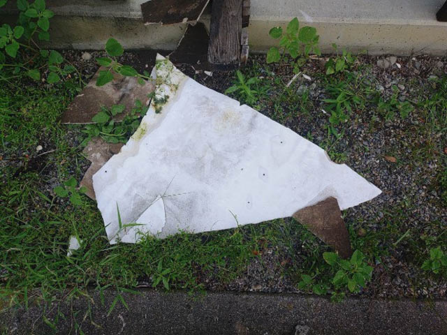 軒先には軒天井の一部が割れて落下していました。