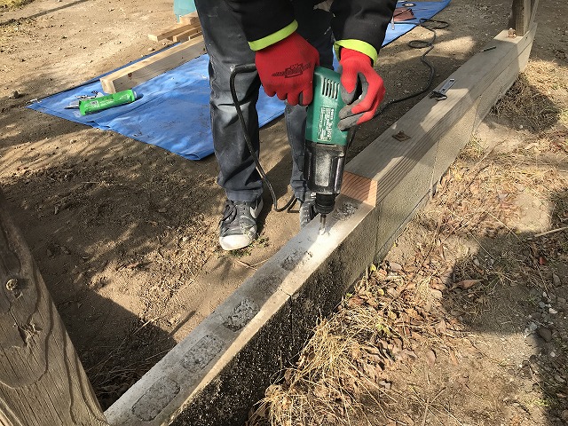 そして新しい土台をボルトで固定するために基礎のところにボルトを受け止めるための穴を空けていきます。