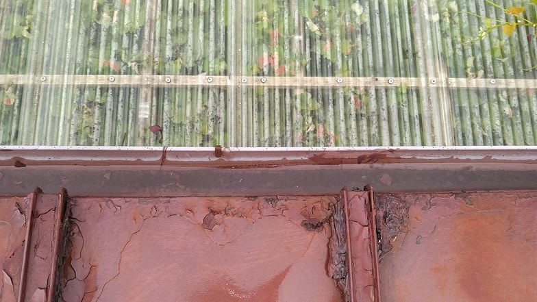 雨樋の中をのぞくと、中には剥がれたトタン屋根の塗装の細かい塗膜が溜まっていました。