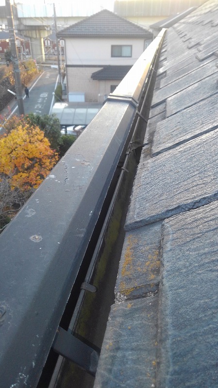 屋根の東西の雨樋には付いていないのですが、屋根の南側の雨樋にだけ、雨樋を隠すための板金が取り付けられていました。