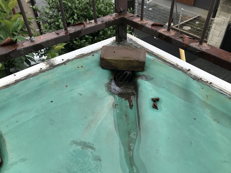 排水口付近には雨水が溜まっています。ここから雨水が軒裏へと漏れているようです。