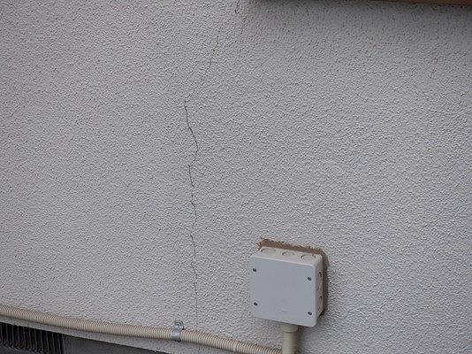 写真中央には外壁のクラック(ひび割れ)ができていることが確認できます。これ以上ひどくならないように外壁の塗装をして補修をしておきたいですね。