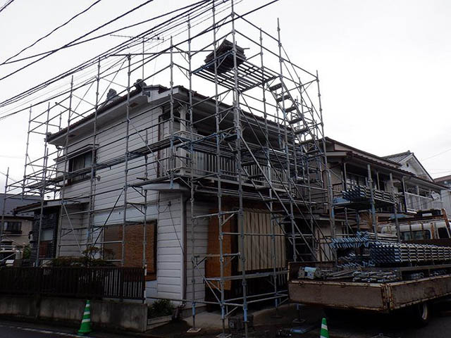通路幅の関係で足場の車は通常1台のところ2台に分けて建物の北側と南側から足場の作業を行います。