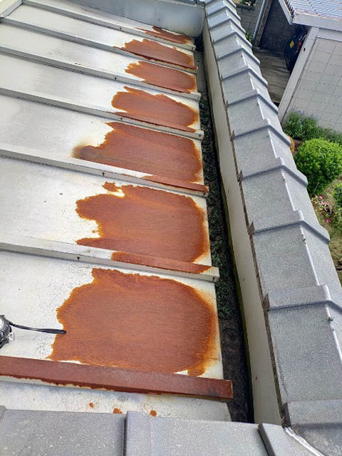 雨樋に水がきちんと流れるか確認をし玄関庇の板金屋根のサビているところにも水をかけて雨漏りしないか確認してみました。