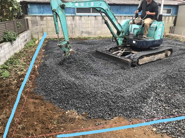 地面に直接土間コンクリートを打つと、そのコンクリートの重みで沈んでしまうおそれがあるので砕石を敷いてそれを防ぎます。