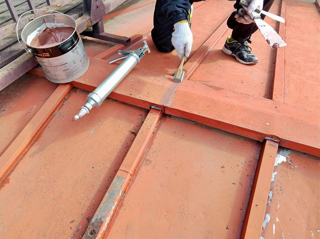 高崎市で雨漏りがしている板金の屋根にケレンとコーキングの作業