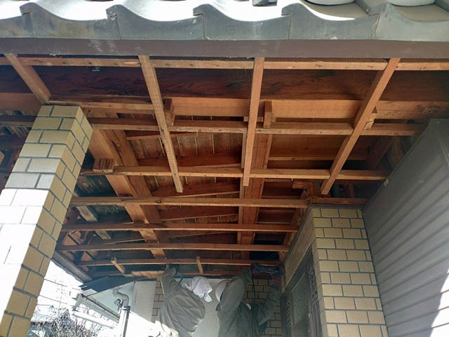 まず雨漏りで傷んだ玄関の軒天井をすべて剥がしていきます。