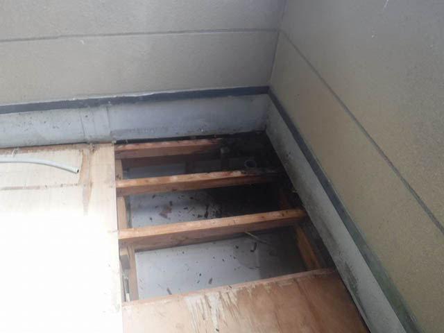 高崎市でベランダの排水口周りで雨漏りが発生したため住環境改善助成金を使いベランダの床を直す工事をしている現場です。