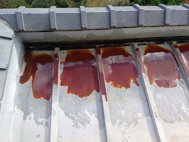 雨樋に水がきちんと流れるか確認をし玄関庇の板金屋根のサビているところにも水をかけて雨漏りしないか確認してみました。
