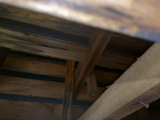 今回のお客様の玄関の軒天井は木製の長い板でできていましたが雨漏りによる腐食で落下してきたようです。