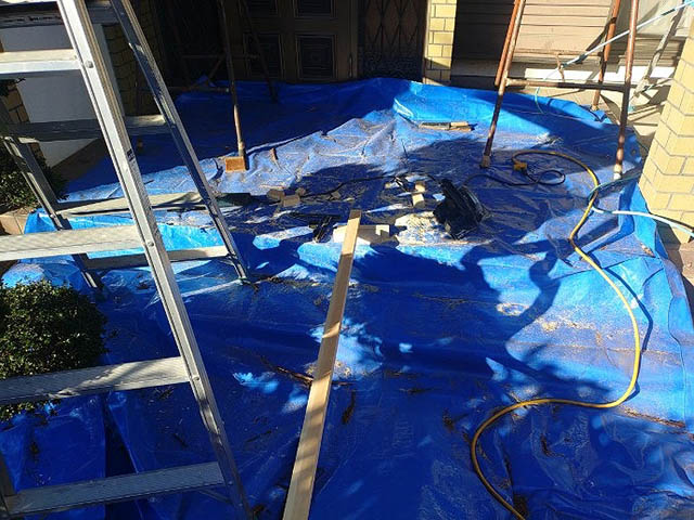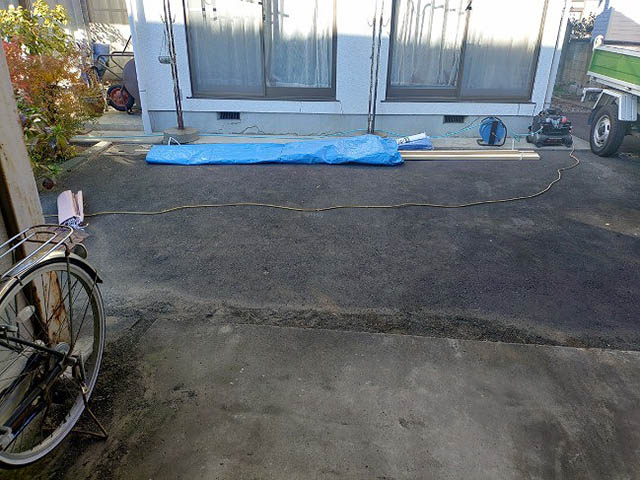 木屑などが散乱しますのでブルーシートで玄関の床を覆います。