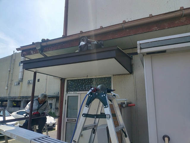 軽くてサビにくいガルバリウム鋼板を現場で切断・折り曲げ加工して庇の形状に合わせて張っていきます。