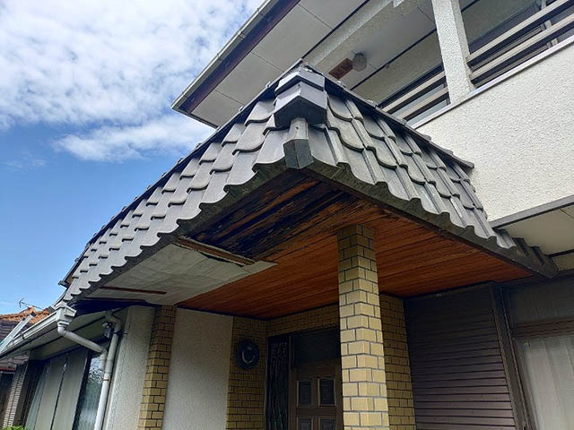 高崎市のお客様の玄関の屋根に雨漏りが発生して軒天井が剥がれ落ちてしまいました。